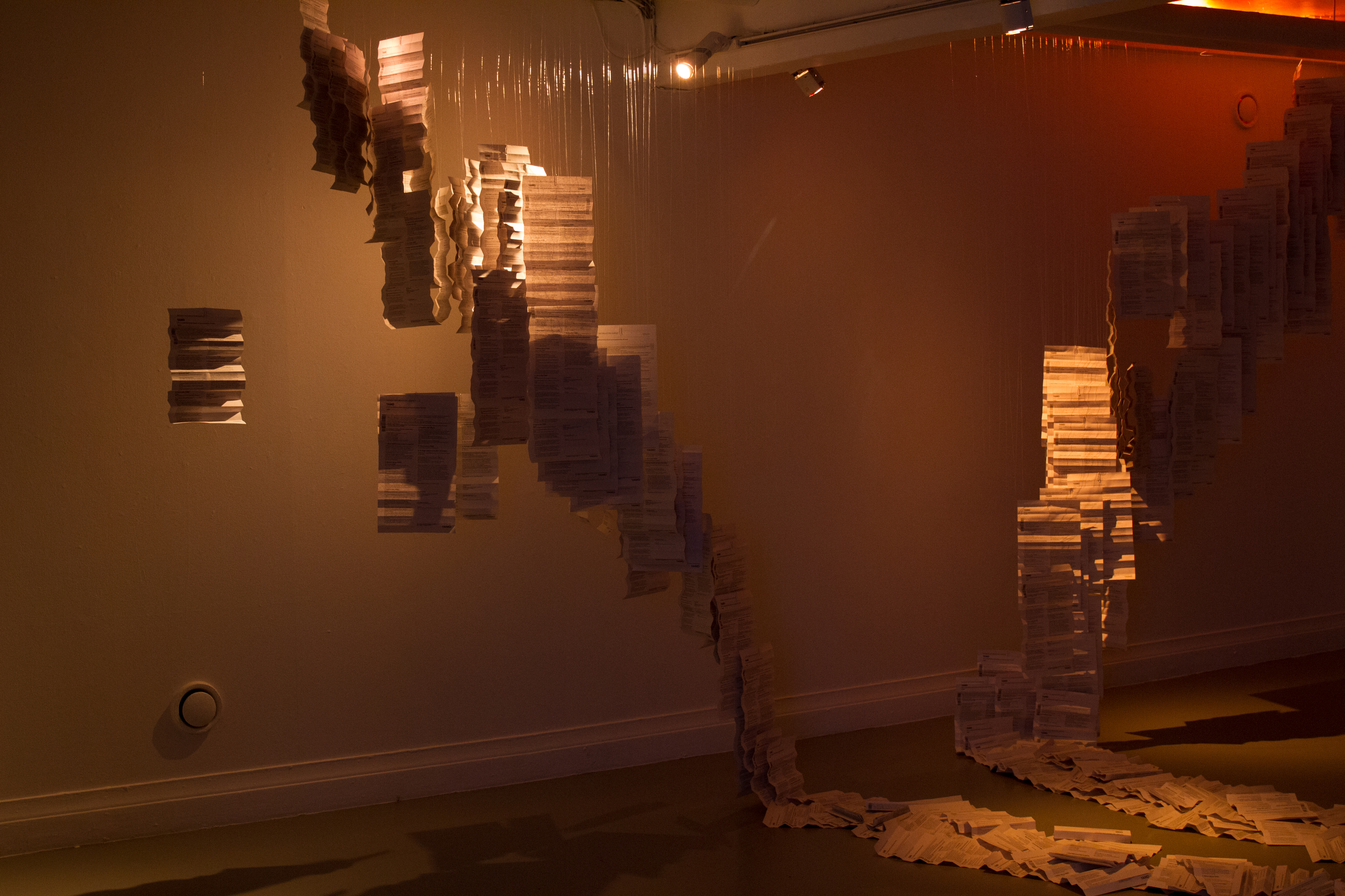 Installation of 461 leaflets, light and shadow, 9:13 minuttes of sound